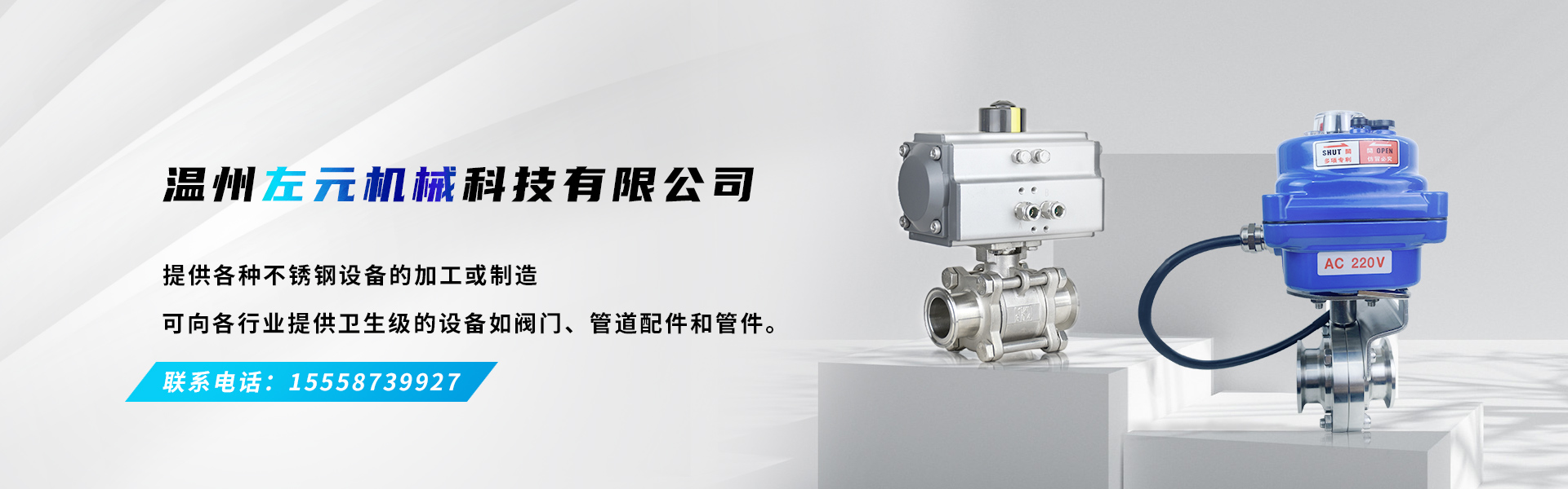 溫州左元機械科技有限公司成立與 2015 年,位于浙江省溫州市濱海園區十四路,主要經營包括衛(wèi)生級手動球閥、氣動球閥、電動球閥、衛(wèi)生級手動蝶閥、氣動蝶閥、電動蝶閥、衛(wèi)生級取樣閥、卡箍、管支架, 以及灌裝設備系列,管件系列等